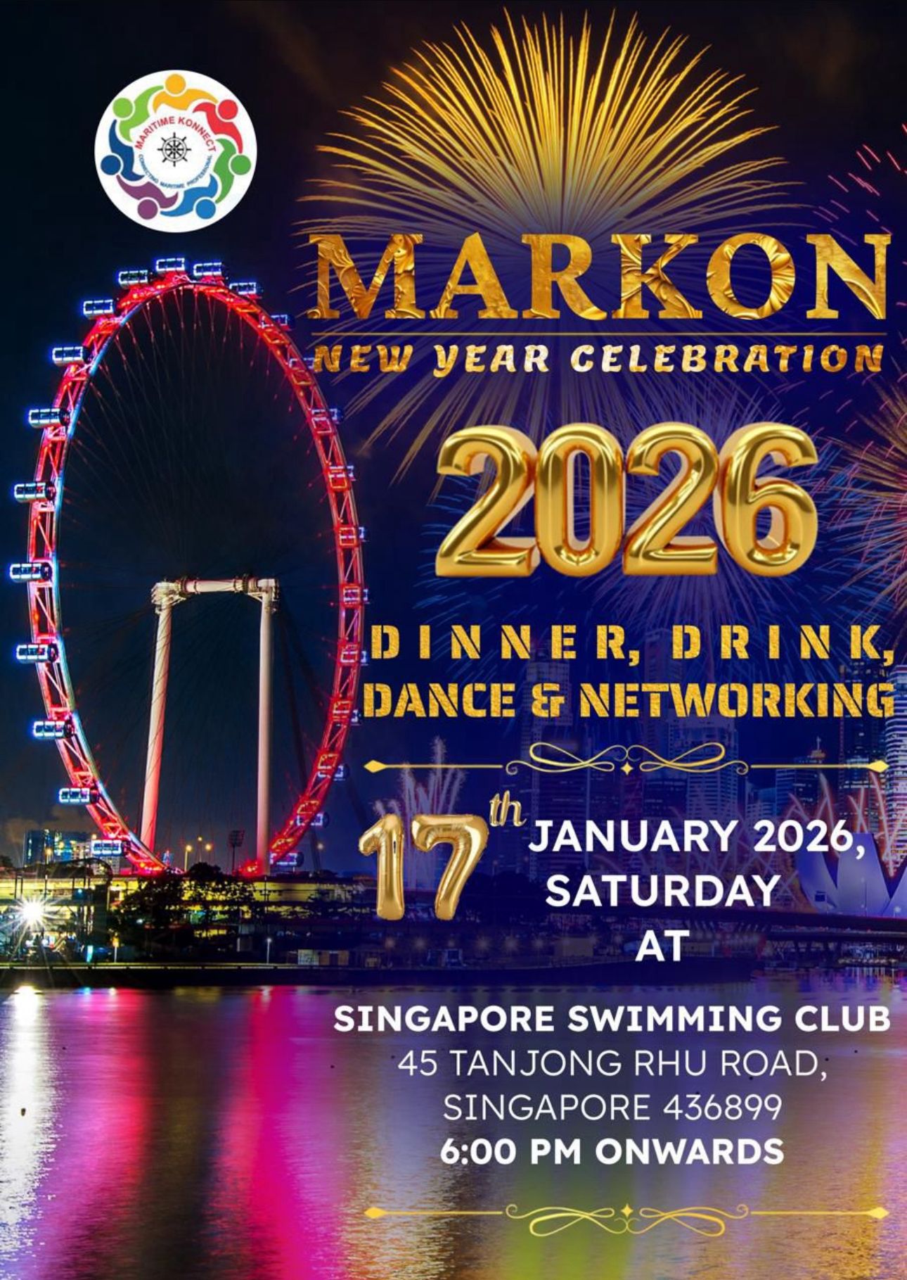 Markon New Year Celebration 2026 Dinner, Dance, Drink, and Netw Saturday 17th January 2026 06:00 PM By Maritime Konnect (MARKON) Singapore Swimming Club, 45 TANJONG RHU Road, Singapore 436899 Read More